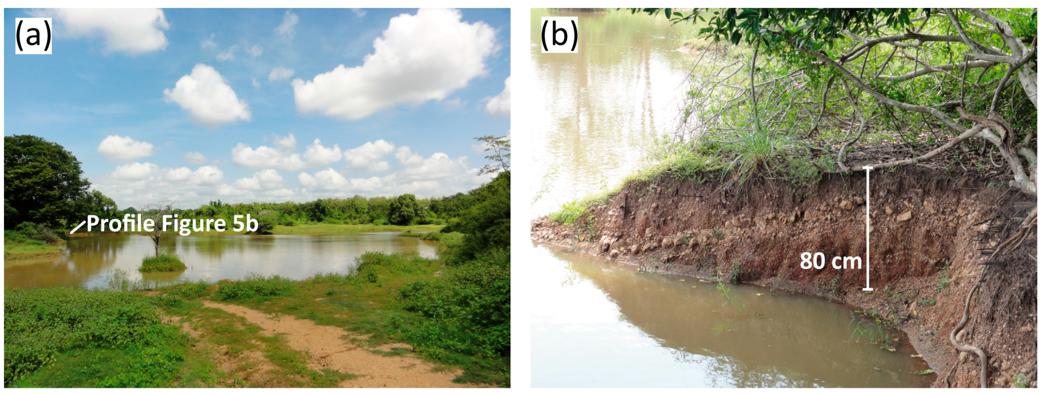 - Schütt, B.; Bebermeier, W.; Meister, J.; Withanachchi, C.R. Characterisation of the Rota Wewa tank cascade system in the vicinity of Anuradhapura, Sri Lanka. Die Erde J. Geogr. Soc. Berl. 2013, 144, 51–68. [Google Scholar]
