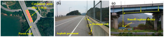 The study site, a 500 m2 asphalt pavement, is located on a highway bridge in Seosan city, South Korea (36°41′53.4′′ N, 126°34′15.9′′ E) (Figure 1a,b). The paved road consists of asphalt and is composed by two lanes. On average, the traffic volume was approximately 8700 vehicles per day for both directions [9]. The annual precipitation in the studied site was 1704 mm (2011), 1642 mm (2012), 1518 mm (2013), 945 mm (2014) and 1045 mm (2015).