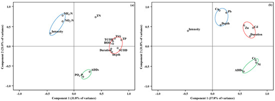 Factor analysis on the relationship between rainfall condition and pollutant concentration: (a) water quality parameters; (b) metals.