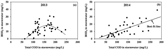 Relationship between total chemical oxygen demand (COD) and biochemical oxygen demand (BOD5) in stormwater: (a) data for 2013; (b) data for 2014.
