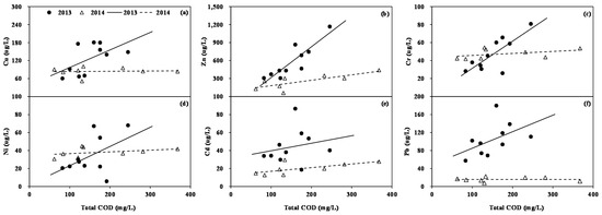 Based on the data investigated from 2013 and 2014, it was observed that BOD5 concentration decreased with increasing total COD concentration in 2013 (Figure 3a). Conversely, it increased as the total COD concentration increased during 2014 (Figure 3b). The different result between the two years was related to differences in the level of toxic matter present in the stormwater runoff, which can inhibit the growth of microorganisms. For the stormwater from the paved road in particular, high levels of heavy metals pose a potential risk to aquatic microorganisms due to their toxicity [15]. Figure 4 shows the relationship between the selected metals (Cu, Zn, Ni, Cd, Cr and Pb) and total COD concentrations during 2013 and 2014. It was found that the concentrations of heavy metals increased as COD concentration increased, especially during 2013.