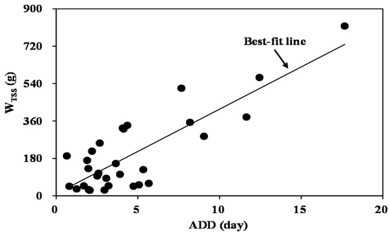 This observation was confirmed by the increment of WTSS in terms of increasing period of dry weather as provided in Figure 5. Generally, the enhanced TSS concentration was significantly correlated with the particle density increase. The high density of the particles was accounted for, as substantial suspended solids appeared in the stormwater. Therefore, the WTSS increased as the number of particle increased over increasing dryness. This outcome revealed that the relationship between density of washed-off particulate and ADDs is closely related with the deposition of dust and dirt on road surface.
