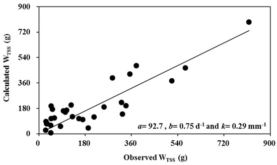 To determine the potential effect of ADDs on the wash-off process, Equation (3) was employed for modelling. Both the calculated and observed masses of washed-off solids were plotted in Figure 6.