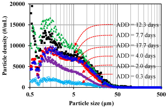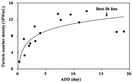 To determine the relationship between the number of dry days and particle density, total particle count was plotted with respect to the duration of the dry weather period. As exhibited in Figure 8, it was clearly observed that the density of washed-off particles is positively related with the dry day span.