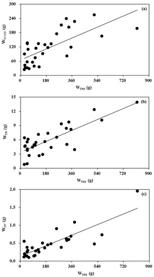 Relationship between TSS load and selected pollutant load: (a) total chemical oxygen demand (TCOD); (b) total nitrogen (TN); (c) total phosphorus (TP).