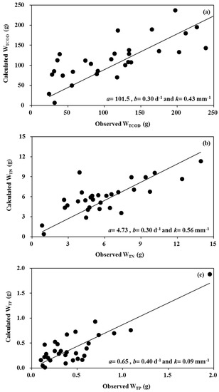 Comparison between observed and calculated washed-off loads of selected pollutants. (a) TCOD; (b) TN; (c) TP.