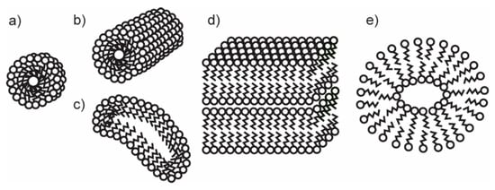 Surfactant aggregates: (a) spherical micelle; (b) cylindrical micelle; (c) worm-like micelle; (d) lamellar formation; and (e) vesicle.