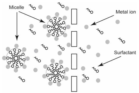 The application of surfactants to a metal-laden water below the CMC promotes the formation of insoluble surfactant-metal complexes [7]. At concentrations above the CMC, the metal ions bind into negatively charged micelles [61]. Both the metal-surfactant complexes and the metal-micelle aggregates can be further removed using micellar enhanced microfiltration (MEMF) or micellar enhanced ultrafiltration (MEUF; Figure 2). MEMF can remove multivalent metal ions from aqueous solutions using membranes manufactured from clays [62]. In MEUF, the surfactants are added at a concentration above their CMC to form large metal-surfactant micelles that are subsequently retained in an ultrafiltration membrane [31,63]. The MEUF increases the removal efficiency of metal ions using surfactants with an electric charge opposite to that of the targeted ions, but it has been suggested that the selectivity of this technique could be improved by using surfactants with the same charge as the metal ions [8,63].
