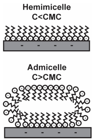 Surfactant modification of a solid surface forming a positive monolayer (hemimicelle) and a positive bilayer (admicelle) on a solid surface [84].