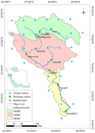 The Karkheh River Basin (KRB) and the three major catchments (Northern Karkheh (NKRB), Central Karkheh (CKRB), and Southern Karkheh (SKRB)). The figure shows the main river, Karkheh dam, 31 climate stations, and 9 observed discharge outlets used for calibration.