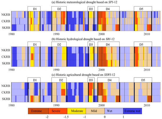 The historic time series of SPI-12, SRI-12, and SSWI-12 in the three catchments (Figure 2) show that the basin experienced most severe drought conditions after 1999 and most extreme wet conditions during 1993–1996. Overall, five drought events (D1–D5) with different meteorological, hydrological, and agricultural drought characteristics were identified between 1980 and 2012 (Figure 2a–c). In the meteorological sector (Figure 2a), the first drought event (D1) started in late 1983 with mostly moderate severity and lasted until late 1984. The event, however, persisted until early 1986 in SKRB. Meteorological drought D2 started in 1989 with mild severity in the three catchments and lasted until late 1991 with severe intensity in NKRB and CKRB. The subsequent event (meteorological D3) in 1997 had a short duration with mostly mild to moderate severity in all catchments. Meteorological event D4 started in mid-1999 with extreme severity. It lasted until 2001 in NKRB and CKRB and until 2004 in SKRB. The basin experienced another extreme event D5 from 2007 to 2010 with higher severity at the beginning and in SKRB at the end of the period.
