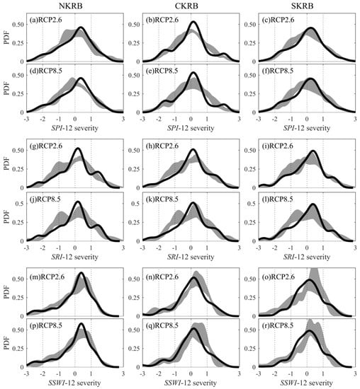 The probability density function (PDF) of different severities of SPI-12 (a–f), SRI-12 (g–l), and SSWI-12 (m–r) in RCP2.6 and RCP8.5 scenarios. The grey bands are extracted from maximum and minimum values in the five GCMs and the black lines indicate the historic PDFs.