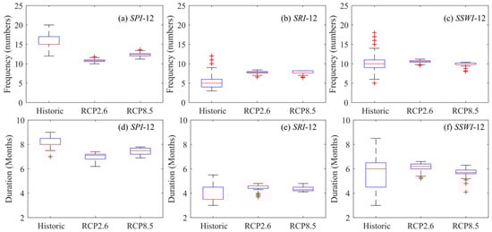 Comparison of the frequency and duration of historic and future of (a,d) SPI-12, (b,e) SRI-12, and (c,f) SSWI-12 droughts based on an ensemble of five GCMs. The red lines inside the boxes show the median, the boxplots show the 25 and 75 percentiles, and the whiskers show 5 and 95 percentiles from 333 subbasins in KRB.