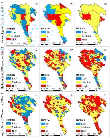 Spatial distributions of the composite meteorological DHI under future climate change conditions show that KRB would probably experience a higher degree of meteorological DHI compared to the historic period. Most of KRB will probably be exposed to medium meteorological DHI except eastern sides of CKRB where high meteorological DHI is predicted. Hydrological DHI responded differently for both historic and future conditions (Figure 5d–f). Generally, KRB is predicted to be more exposed to high hydrological DHI in western NKRB and CKRB. SKRB will probably be less exposed to high hydrological DHI. High agricultural DHI during the historic period was limited to the western part of KRB (Figure 5a,d), however, both RCP2.6 and RCP8.5 predict higher agricultural DHI (Figure 5g–i) in all catchments. In fact, RCP8.5 puts most of KRB under high agricultural DHI.