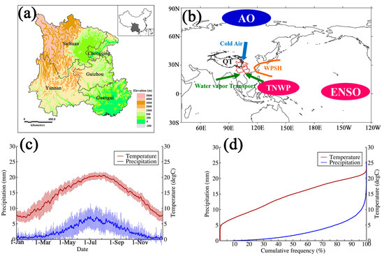 (a) Topography of Southwest China (SWC) and its geographic location in China (top right). (b) Schematic diagram of the influential atmospheric factors related to droughts in SWC [2]. TNWP, ENSO, WPSH, AO and QT stand for the tropical Northwest Pacific, El Niño Southern Oscillation, Western Pacific Subtropical High, Arctic Oscillation, and the Qinghai–Tibet Plateau, respectively. (c) Temporal evolution of mean daily observed precipitation and temperature (1979–2014) averaged over SWC. Thick lines represent daily values, while light shadows stands for one standard deviation. (d) Cumulative frequency distribution of all daily precipitation and temperature (1979–2014) averaged over SWC.