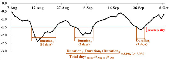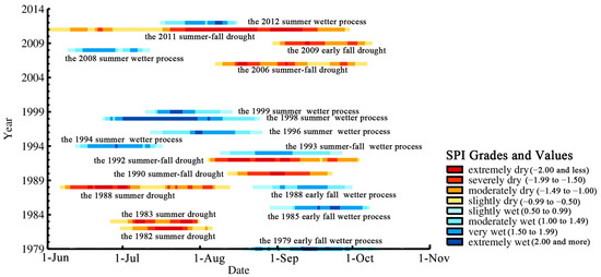 As shown in Figure 3, over the 36-year period from 1979 to 2014, eight drought processes and ten wetter processes occurred with severe or extreme grades. Among these processes, the severity of both the 1992 and the 2011 processes was extremely dry, whereas that of the 1998 process was extremely wet. For convenience, we treated extreme drought and wetter processes as severe processes. Despite various durations and severity, the drought and wetter processes were both evenly distributed throughout the summer and early fall periods.