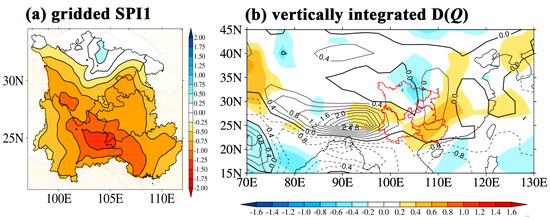 Composite of: (a) gridded SPI1; and (b) vertically integrated water vapor flux divergence (D(Q); contours) and its standardized anomalies (SA; shadows) during drought processes in Southwest China (SWC). The unit of D(Q) is 10−4·kg·s−1·m−2.