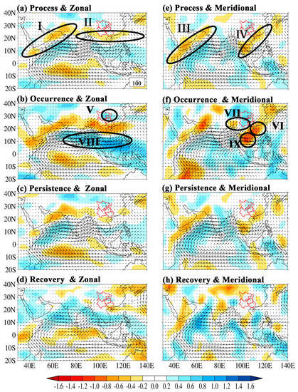 Composites of vertically integrated water vapor transport (WVT) and their zonal standardized anomalies (SA) for drought: (a) processes; (b) occurrence; (c) persistence; and (d) recovery phases; and (e–h) the same as (a–d), respectively, but for meridional SA. Vectors represent vertically integrated WVT, whereas shadows represent zonal or meridional SA. The unit of WVT is kg·m−1·s−1. The northward and eastward direction of transport is positive.