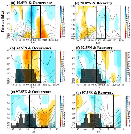 Because the WVT anomalies at the boundaries of SWC have direct effects on the evolution of drought processes, the vertical features of these anomalies at the boundaries were investigated. As shown in Figure 6a, two meridionally less-than-normal WVT anomalies were located at 850–1000 hPa over 85.0° E–95.0° E and 600–1000 hPa over 100.0° E–120.0° E. The meridionally more-than-normal transport was located at 300–600 hPa over 92.5° E–102.5° E. This anomalous configuration is associated with geographically meridional WVT anomalies (Figure 5f). However, while turning to the recovery phase (Figure 6e), the two weak transport centers disappeared, and the strong transport center at the upper level became weak and moved from 97.5° E to 110° E. Similar temporal-evolution features occurred along 97.5° E and 110° E.