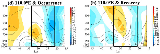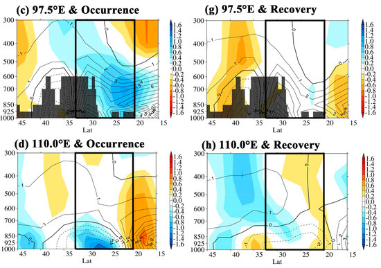 Vertical cross-sections of composite meridional or zonal water vapor transport (WVT) for wetter: (a–d) occurrence; and (e–h) recovery at boundaries of Southwest China (SWC). Contours represent WVT, for which the unit is 10−1 kg·m−1·s−1·hPa−1. Standardized anomalies (SA) are shown by shadows, whereas warm and cold colors indicate inflow and outflow, respectively. The bold black box indicates the area over SWC. The black shadow areas in (b,c,f,g) represent the Qinghai–Tibet Plateau.