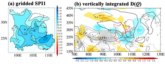 Composite of: (a) gridded SPI1; and (b) vertically integrated water vapor flux divergence (D(Q); contours) and its standardized anomalies (SA; shadows) during wetter processes in Southwest China (SWC). The unit of D(Q) is 10−4·kg·s−1·m−2.