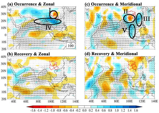 Considering the representativeness of the different phases for WVT anomalies, the wet occurrence and recovery were selected for comparison. As shown in Figure 8, the anomalies in Area IV and V had reverse signals of those in Figure 5b,f. This indicates that the WVT anomalies of the Somali and IndoChina-Peninsula channels are also distinguishable, in terms of occurrence phases of drought and wetter processes. Furthermore, two valuable characteristics of WVT anomalies were found at the synoptic scale. As shown in Area II in Figure 8, one branch of the Somali channel entered SWC from its southwest corner, which indicates sign reversal from that of Area VII in Figure 5. Moreover, by combining Area I and Area III in Figure 8, negative zonal WVT anomalies and positive meridional WVT anomalies can be found. This WVT branch came from the SCS but originated from the cross-equator jets and southwest summer monsoon. This analysis indicates that both southwest and northeast parts are key regions of WVT anomalies. Compared with those during wet occurrence, the configurations of SA during wet recovery disappeared or became weaker.