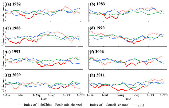 As shown in Table 2 and Figure 11, the index of the IndoChina-Peninsula channel had significant synchronous correlation with SPI1 during seven drought processes, whereas the index of the Somali channel had significant synchronous correlation during only four drought processes. The synchronous correlation coefficient of the Somali channel and the 1982 summer drought process was 0.83, whereas that of the IndoChina-Peninsula channel and the 1992 summer–fall drought process was 0.82. During the 2009 early fall drought and the 2011 summer–fall drought processes, they were both significantly related to these two anomalous WVT channels despite the negative synchronous correlations. Moreover, these two anomalous WVT channels had high synchronous correlation with the development of wetter processes.