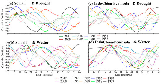 (4) The IndoChina-Peninsula channel performed better in correlations with these drought and wetter processes than the Somali channel. The lagged correlations between the IndoChina-Peninsula channel and most of the identified wetter processes peaked for the first time before the 25th day of lead time.