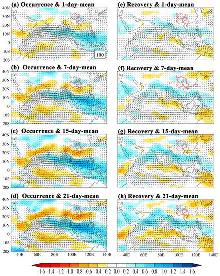 Composite of vertically integrated water vapor transport (WVT) and different duration running mean zonal standardized anomalies (SA) for drought: (a–d) occurrence; and (e–h) recovery phases. Vectors represent WVT, whereas shadows represent SA. The unit of WVT is kg·m−1·s−1. The eastern direction of transport is positive.