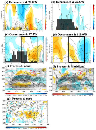 (a–d) Same as Figure 6a–d, respectively, which represent vertical cross-sections of composited meridional or zonal water vapor transport (WVT) for drought occurrences at the boundaries of Southwest China (SWC). (e,f) Same as Figure 5a,e, which are composites of: (e) zonal; and (f) meridional standardized anomalies (SA) of vertically integrated water vapor transport (WVT) for drought processes. (g) Same Figure 4b, which represents a composite of drought processes for vertically integrated water vapor flux divergence (D(Q); contours) and its standardized anomalies (SA; shadows) in SWC. The original data source of (a–g) is ERA-Interim re-analysis datasets.