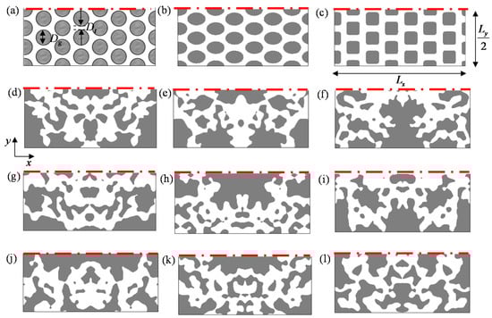 Regular elementary cells (a) HDa, (b) HDb, (c) HDc and randomly generated elementary cells (d) E1, (e) E2, (f) E3, (g) E4, (h) E5, (i) E6, (j) E7, (k) E8, and (l) E9. Gray and white regions respectively correspond to the solid matrix and to the pore space. Horizontal dashed-dotted lines indicate axes of symmetry of the systems. Lx: size of the medium along x-; Ly: size of the medium along y-; Dg: grain diameter; Dt: throat diameter.