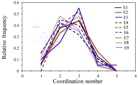 Relative frequency of the coordination number in the random samples Ei (i = 1, ..., 9).