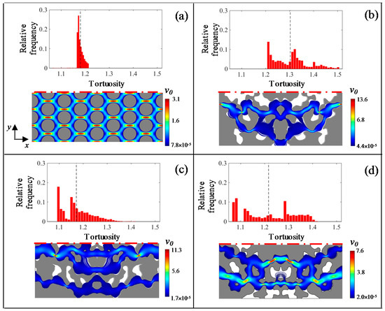 Histogram of tortuosity, , and particle trajectories through the elementary cells (color scale expressed in terms of local normalized velocity , being the norm of the velocity vector v and its mean) for (a) HDa, (b) E1, (c) E4, and (d) E8. Vertical dashed lines correspond to mean tortuosity. Horizontal dashed-dotted lines indicate the axes of symmetry of the systems.