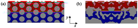 Example of initial oil (red) and water (blue) phase distribution pattern within (a) HDa and (b) E4 for So = 0.5. Horizontal dashed-dotted lines indicate axes of symmetry of the systems.
