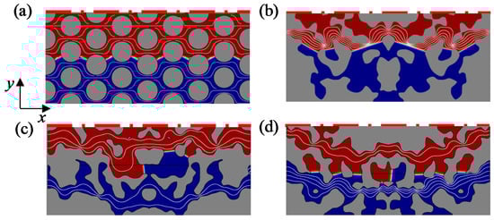 Distribution of the two phases (oil, in red; water, in blue) at steady state with θ = 90° for (a) HDa and So = 0.42, (b) E1 and So = 0.49, (c) E4 and So = 0.50, and (d) E8 and So = 0.49. Streamlines of the flow field are plotted as white curves.