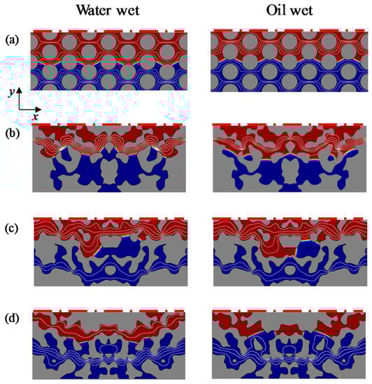 Spatial distribution of the two phases (oil, in red; water, in blue) at steady state with θ = 60° (WW) and θ = 120° (OW) at (a) HDa with So = 0.53 (WW) and So = 0.47 (OW); (b) E1 with So = 0.53 (WW) and So = 0.56 (OW); (c) E4 with So = 0.48 (WW) and So = 0.52 (OW); and (d) E8 with So = 0.49 (WW) and So = 0.47 (OW). Streamlines of the flow field are plotted as white curves. WW: water wet, OW: oil wet.