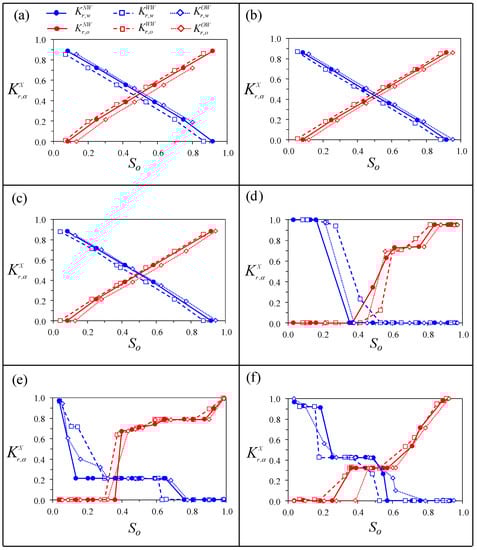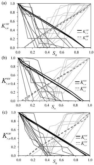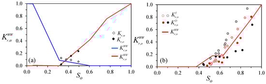 Figure 9a,b juxtapose the selected numerical results depicted in Figure 8b (curves) and the relative permeability values estimated in the considered experimental studies (symbols). Note that the experimental and numerical analyses have been performed under different conditions, e.g., in terms of the physicochemical properties of the fluids employed (see Table 4). It can be seen that the results associated with our random elementary cells are qualitatively consistent with the behavior displayed by the available relative permeability information. In this sense, it can be recognized that our relative permeability results for the random geometries display features that can be observed also in the experimental studies, namely: (a) the lack of connectivity of the oil phase for values of So smaller than a given threshold; and (b) relative permeability curves that vary in a highly non-linear fashion with fluid saturation.