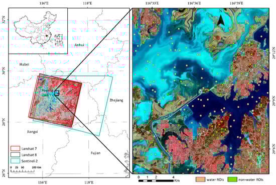 We chose a case region in the Poyang Lake Basin as our study area. Poyang Lake is the largest freshwater lake in China, and is located in the north of the Jiangxi Province and the south-west border of the Anhui Province. The study area was selected deliberately to ensure that the water surface there remains submerged throughout the year. Relatively shallow and deep freshwater bodies both exist in the study area, and the water bodies in the northern half are shallower than those in the southern half. We also made sure that the case region had effective observations from Landsat 7 ETM+, Landsat 8 OLI, and Sentinel-2 MSI. The detailed location is shown in Figure 1.