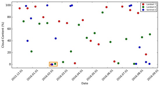 Data availability and cloud contents of Landsat 7 ETM+, Landsat 8 OLI, and Sentinel-2 MSI images from December 2015 to September 2016. The selection of the compared group considered the temporal adjacency among them and cloud effects.