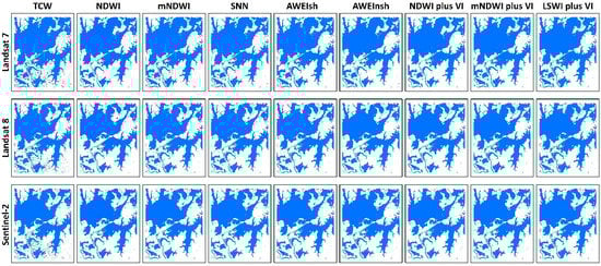 Contrast of the resultant open surface water body maps from 27 combinations of the nine algorithms (refer to Table 2) and the three sensors (Landsat 7 ETM+, Landsat 8 OLI, and Sentinel-2 MSI).