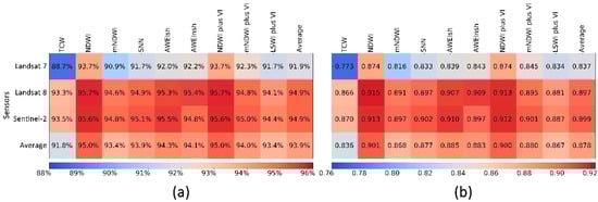 In terms of the performances of the nine algorithms, the NDWI-based algorithm and NDWI plus VI-based algorithm were stable and they shared the same highest overall accuracy for each sensor, while the TCW-based algorithm had the lowest accuracy for each sensor. Both the NDWI-based algorithm and NDWI plus VI-based algorithm had the same highest average overall accuracy of the three sensors (95.0%), followed by those algorithms based on AWEIsh (94.3%), AWEInsh (94.1%), mNDWI plus VI (94.0%), SNN (93.9%), mNDWI (93.4%), and LSWI plus VI (93.4%), while the TCW-based algorithm had the lowest average overall accuracy of 91.8%. The NDWI-based algorithm and the NDWI plus VI-based algorithm had high Kappa coefficients of ~0.90 for the three sensors. Specifically, the NDWI-based algorithm and NDWI plus VI-based algorithm had the same Kappa coefficients (0.874) when using Landsat 7 ETM+ data; while the Kappa coefficient was higher (~0.91) with a slight difference when using the Landsat 8 OLI and Sentinel-2 MSI data.