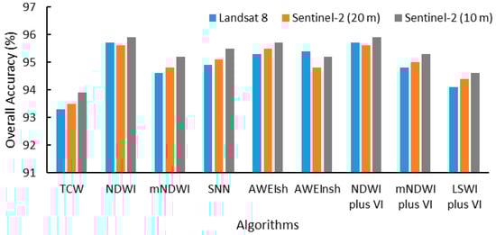 In terms of the performance difference between Landsat 8 OLI and Sentinel-2 MSI, the overall performance was almost the same. The average of the overall accuracy of all of the nine algorithms using the Landsat 8 OLI data was the same as that using the Sentinel-2 MSI data (Average OA = 94.9%). This could be attributed to the similar band wavelength of the two sensors, specifically, the central wavelength of band SWIR-1 in both sensors is 1.61 µm. The radiometric resolution of Sentinel-2 MSI is as same as Landsat 8 OLI (12-bit) [68] despite the higher spatial resolution of Sentinel-2 MSI.