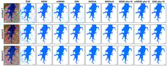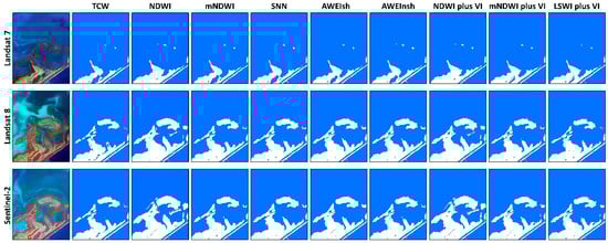 Contrast of the shallow water body mapping results from 27 combinations of the nine algorithms (refer to Table 2) and the three sensors (Landsat 7 ETM+, Landsat 8 OLI, and Sentinel-2 MSI).