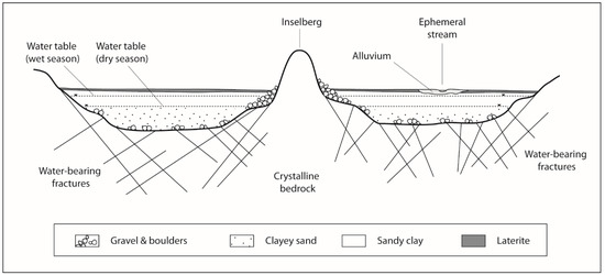 The area features a predominantly flat landscape, sloping gently from the piedmont of the Mandingue Plateau (altitude ≈380 m a.s.l.) to the River Niger (≈320 m a.s.l.). From the geological standpoint, it presents a classic weathering pattern found in many sub-Saharan bedrock aquifers [52,53] (Figure 2). For drilling purposes, it is best defined as a three-layer system [54]. The bedrock is made up of massive granite and schists. In many parts of the world, crystalline rocks are considered impervious for practical purposes. The main reason is that these are highly anisotropic and that the matrix presents negligible porosity coefficients. Groundwater may be stored in the fractures, but these tend to yield only moderate amounts of water [22,55]. Weathering products overlie the bedrock. The thickness of the unconsolidated weathered pack in the study area typically ranges between 20 and 40 m. It is made up of sand and boulders at the bottom, while clay content increases towards the surface. This means that the bottom part is generally more favorable to groundwater flow. The clayey unit behaves as a leaky aquifer that may store modest amounts of groundwater. The third and uppermost layer of the system consists in a hard laterite crust. Laterite is thinner (typically less than 10 m), impervious and discontinuous in space [42,56]. Alluvial deposits are found along streambeds (Figure 3). These are relatively thin except in the case of the River Niger, whose sediment pack may exceed 20 meters [56].