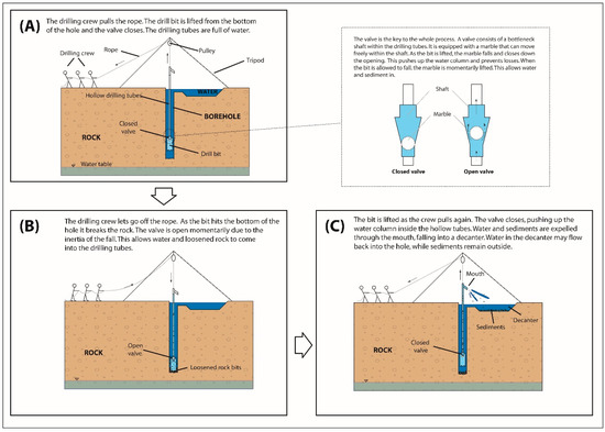 There are four mainstream methods to drill boreholes by hand, namely augering, sludging, jetting, and percussion [51]. Each of them presents a wide diversity of alternatives, which are frequently associated with specific hydrogeological contexts. As noted above, this research refers to a drilling method that combines percussion and reverse water circulation and whose use is relatively widespread in Africa and Latin America [59].