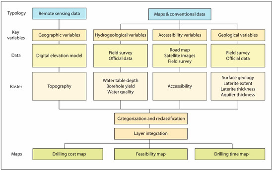 This paper has presented an approach to map the feasibility of manual borehole-drilling based on water table depth, accessibility, geology, water quality and aquifer potential. A geospatial database was compiled by integrating remote sensing information, traditional cartography, and data from field surveys so as to identify favorable lands for drilling in a rural region of Mali. Care was taken to express the outcomes not only in terms of technical feasibility, but also of time and cost. This constitutes one of the main methodological novelties of the paper. The results show that most of the study area presents medium to high feasibility for manual drilling. Costs range widely. A fully-equipped two-inch diameter borehole costs between USD200 and 600, while drilling times range between three and 10 days throughout most of the region. Four-inch boreholes are more expensive due to increased labor costs and a wider choice of pumping systems. The overall cost of drilling and equipping a larger-diameter borehole is highly variable because it largely depends on pump type. The results are consistent with hands-on experience and present a reasonable agreement with an independent estimate of drilling time based on geophysical methods. This suggests that the GIS database produces an adequate portrayal of the field conditions.