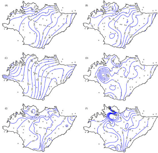 Spatial distribution of the water table elevation as per different geostatistical interpolation methods (field data collected over four consecutive days in February 2015): (A) Ordinary kriging; (B) minimum curvature; (C) polynomial regression; (D) modified Shepard’s method; (E) inverse distance to power; (F) radial basis function.