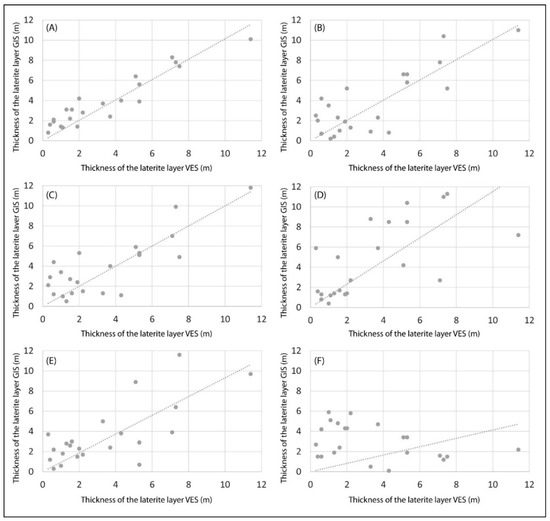 Calibration of the spatial distribution of subsurface geology: spatial database outcomes versus geophysical survey results. (A) Ordinary kriging; (B) minimum curvature; (C) radial basis function; (D) modified Shepard’s method; (E) inverse distance to power; (F) polynomial regression. VES: Vertical electrical sounding.