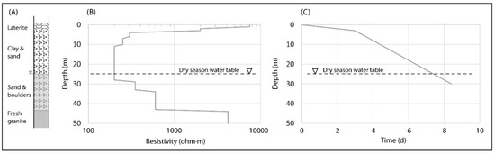 (A) Geological section; (B) resistivity curve obtained by vertical electrical sounding; (C) drilling time in days.
