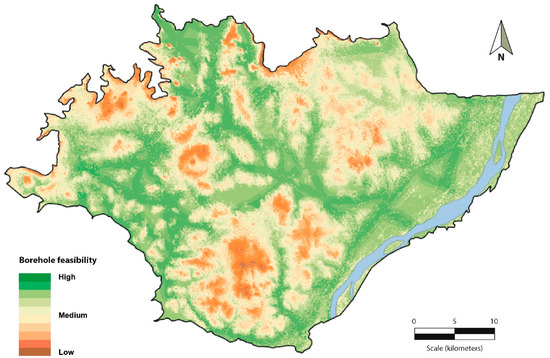 Methodological precedents on mapping the feasibility of manual borehole drilling are limited. National-scale maps for drilling manual boreholes have been developed for different African countries in recent years [34,35,36]. Other authors narrow down the geographical focus, thus attaining a higher spatial resolution in the results [37,38]. Geographical and geological variables have been demonstrated to constrain the efficiency of manual drilling [39,40,41]. For instance, progress may be reasonably fast in softer formations such as clay or sand, where it is possible to drill several meters per hour. Conversely, drilling rates in hardened layers may slow to just a few centimeters per day. The hardness factor is closely linked to the depth to the water table, which in turn translates into time, cost, and the potential to encounter unexpected difficulties. This implies that lowlands tend to be more suitable for manual boreholes than highlands. Other aspects, including accessibility, water quality, slope, or the aquifer’s hydrodynamic parameters also need to be taken into account, as they influence both the drilling process and the usability of the borehole [42].